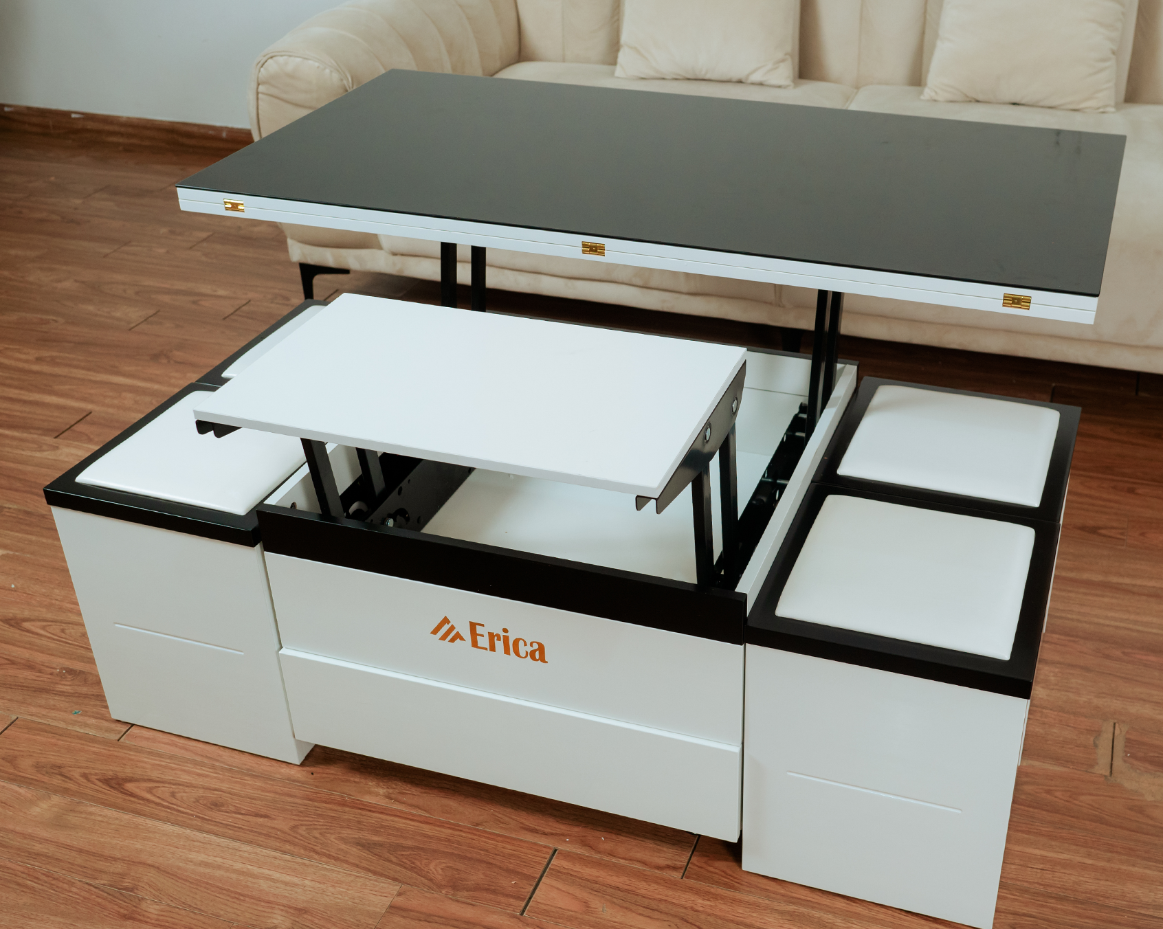 Bộ bàn ăn thông minh này có thiết kế cực sáng tạo khi sử dụng quy luật xếp gấp thông minh của nội thất Nhật Bản. Có thể gập mở một cách linh hoạt với 3 hình thái chính: Mở rộng hoàn toàn – Thu gọn 1 nửa – Gấp gọn hoàn toàn, đáp ứng mọi nhu cầu sử dụng. Bộ bàn được làm từ gỗ MDF đạt tiêu chuẩn E1, khung chân kim loại phủ sơn tĩnh điện chống gỉ – chống bong tróc. Các cạnh góc được bo tròn, đánh bóng kỹ lưỡng, an toàn tuyệt đối mỗi khi sử dụng.