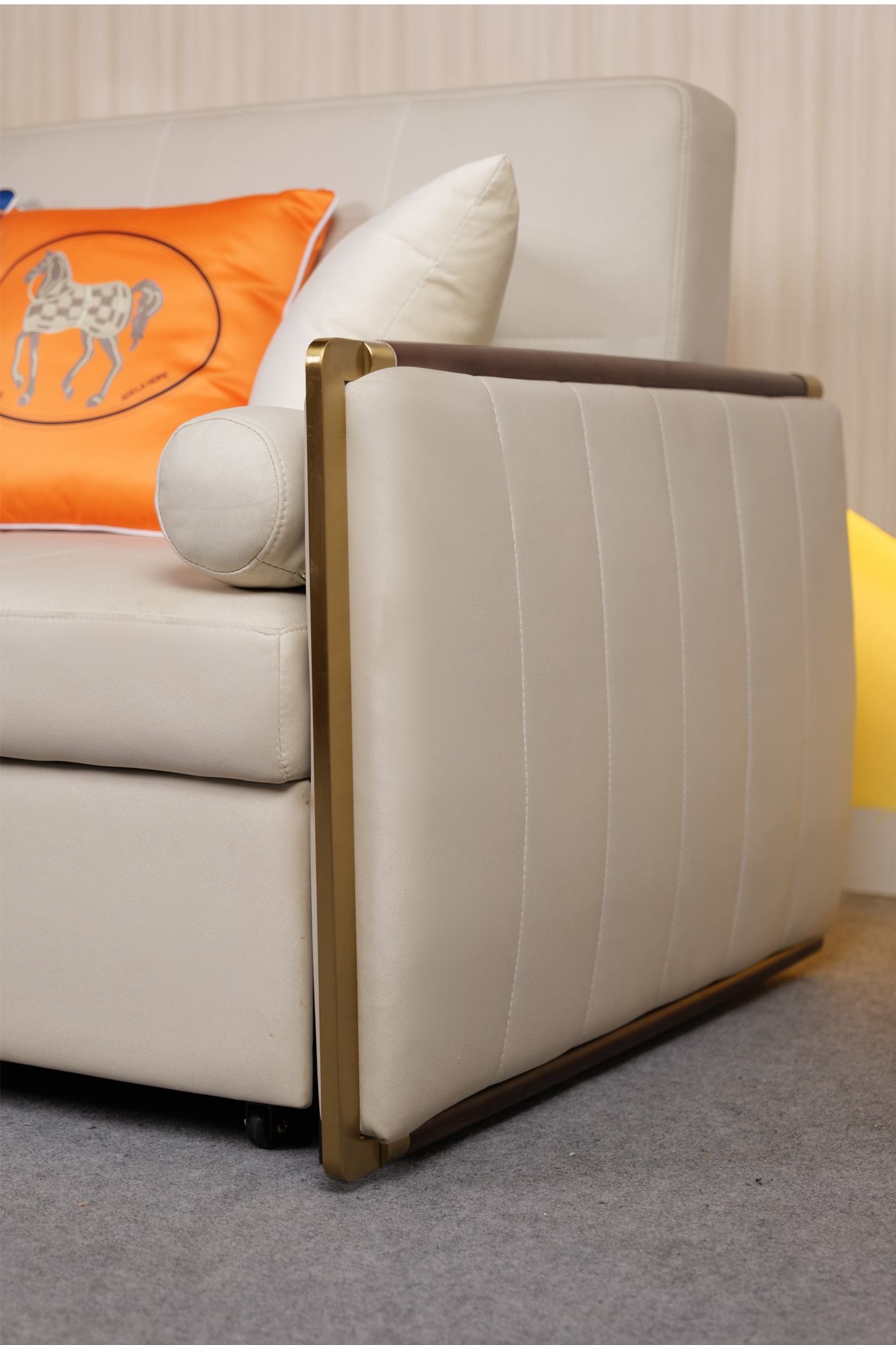 Có thể nói, chi tiết mạ vàng lấp lánh là nét đặc trưng dễ thấy nhất của mẫu sofa giường gấp này. Chi tiết này được hiện diện ở phần tay vịn, được phun sơn titan màu vàng óng ánh, khi kết hợp với ánh đèn huyền ảo, sẽ đem lại một không gian sống cực mỹ miều.