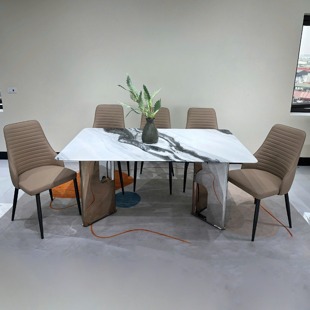 Bộ bàn ghế ăn ERICA – DP06 là sự kết hợp hoàn hảo giữa thiết kế thời thượng và tính tiện dụng, phù hợp với hầu hết các phong cách nội thất từ cổ điển đến hiện đại. Sản phẩm mang phong cách châu Âu với các đường nét tinh xảo và màu sắc trang nhã. Mặt bàn đá với hoa văn vân mây tự nhiên nổi bật, không chỉ làm tăng thêm vẻ sang trọng mà còn thể hiện gu thẩm mỹ tinh tế của gia chủ. Thiết kế chân bàn hình chữ X độc đáo không chỉ mang đến độ ổn định vững chắc mà còn là điểm nhấn thẩm mỹ, làm nổi bật không gian nhà bạn.