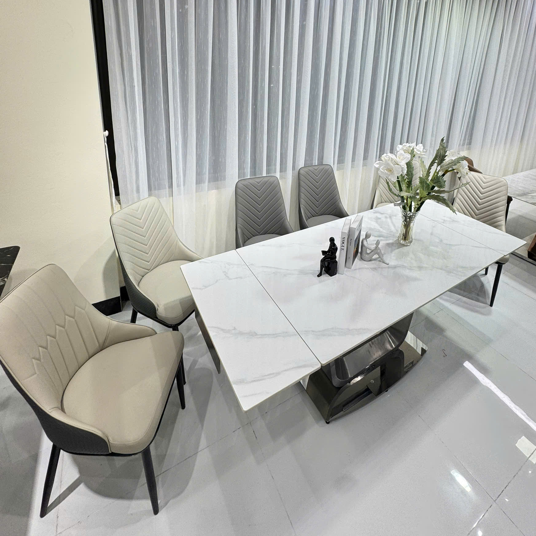 Bộ bàn ăn này mang phong cách châu Âu hiện đại với các đường nét tinh xảo và màu sắc trang nhã. Mặt bàn đá với hoa văn vân mây tự nhiên nổi bật, không chỉ làm tăng thêm vẻ sang trọng mà còn thể hiện gu thẩm mỹ tinh tế của gia chủ. Thiết kế chân bàn hình chữ X hiện đại và độc đáo, bằng inox mạ crom sáng bóng, không chỉ mang đến sự chắc chắn mà còn tạo điểm nhấn thẩm mỹ cho cả bộ bàn.