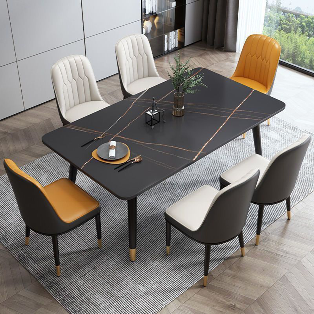 Bộ bàn ăn 6 ghế này sở hữu thiết kế đậm chất Châu Âu, chất liệu cao cấp cùng sự tiện nghi vượt trội, chắc chắn sẽ trở thành tâm điểm ấn tượng trong mọi không gian. Mặt bàn bằng đá có độ cứng cao, bề mặt mịn màng, đường vân tự nhiên rõ nét, màu sắc bóng mượt quyến rũ. Khung chân trụ phá cách theo dáng chữ X bằng kim loại chịu lực kết hợp cùng tone màu đen huyền bí, khiến chiếc bàn trông thật cá tính. Các viền cạnh bàn được gia công nhẵn mịn, đánh bóng cẩn thận, nhằm loại bỏ sự sắc nhọn gây nguy hiểm cho người sử dụng.