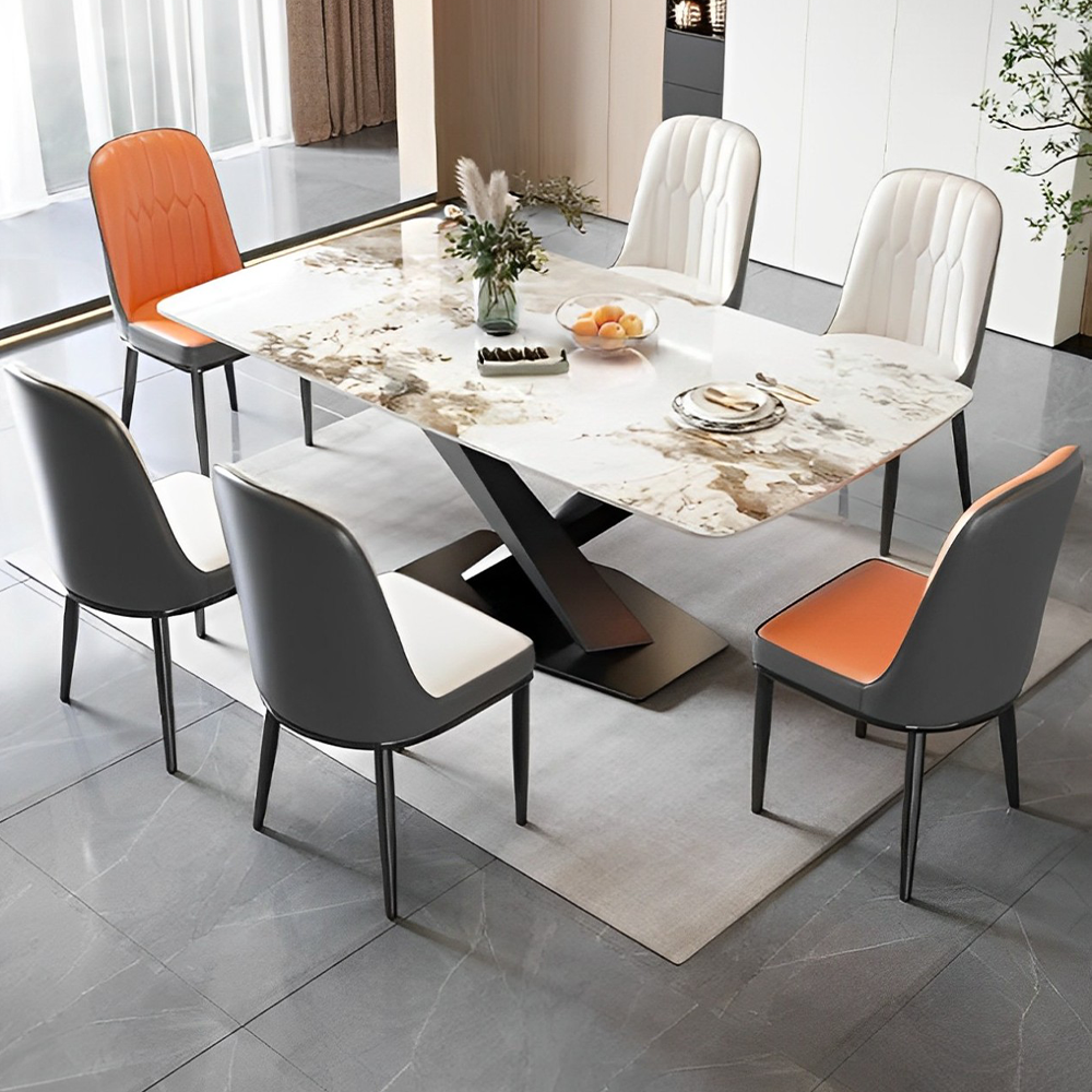 Bộ bàn ăn 6 ghế này mang phong cách châu Âu hiện đại với các đường nét tinh xảo và màu sắc trang nhã. Nổi bật với vân đá cao cấp, uyển chuyển và độc đáo, lướt nhẹ nhàng trên bề mặt bàn. Thiết kế chân bàn hình chữ X hiện đại và độc đáo, bằng inox mạ crom sáng bóng, không chỉ mang đến sự chắc chắn mà còn tạo điểm nhấn thẩm mỹ cho bộ bàn.